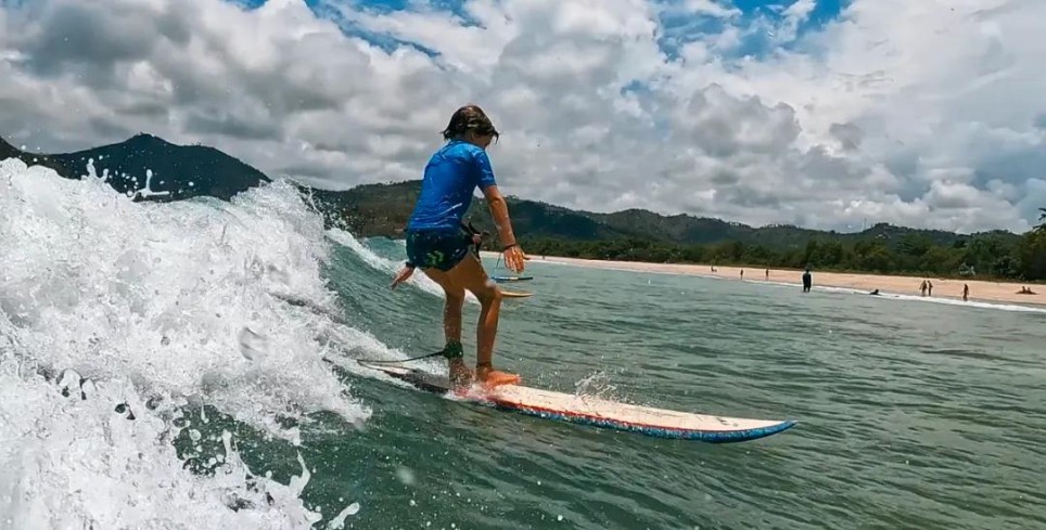 9岁的雷欧想学冲浪,他们就去到印尼,让雷欧体验冲浪的刺激。