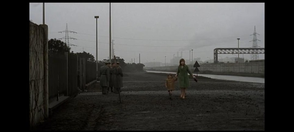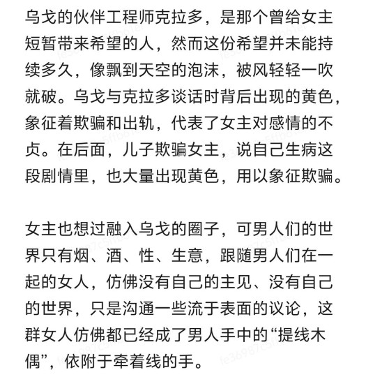 女主朱莉·安娜,她神经质、焦虑、缺乏安全感,从她丈夫与外人的交谈中得知,女主曾经遇过车祸,虽身体无大碍,但脑部受到了震荡,丈夫轻描淡写的口气好像事不关己,充斥着冷漠与自私。女主的存在与周围的世界格格不入。蓝色,冰冷、抑郁、疏离;白色,虚无、困惑、寂寞,房间中色彩的渲染大量采用蓝色与白色的交织,放大了不安和孤独,她与丈夫乌戈的感情,同工业区的废墟一样,呈现一种破败的状态。